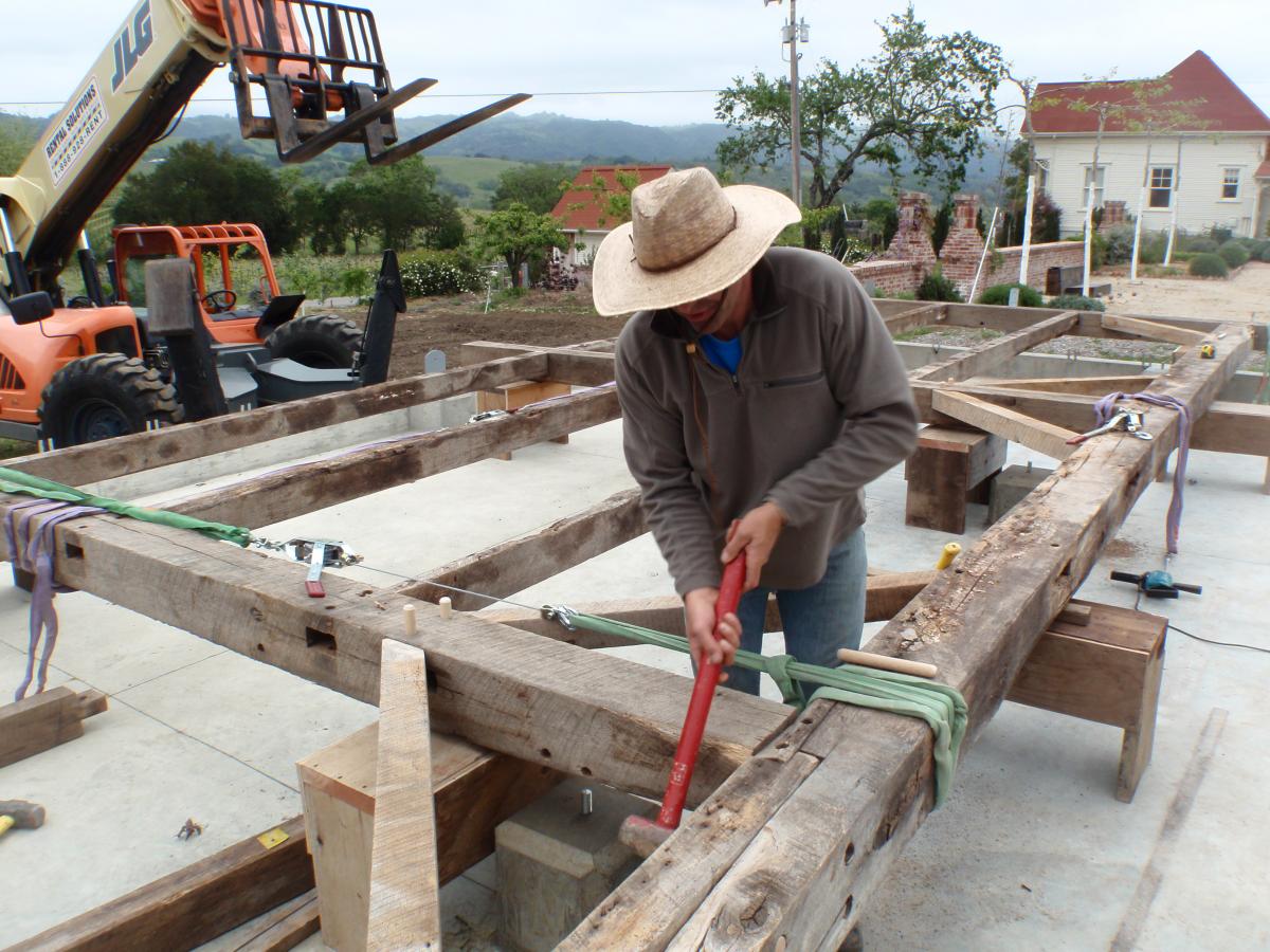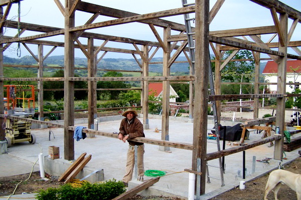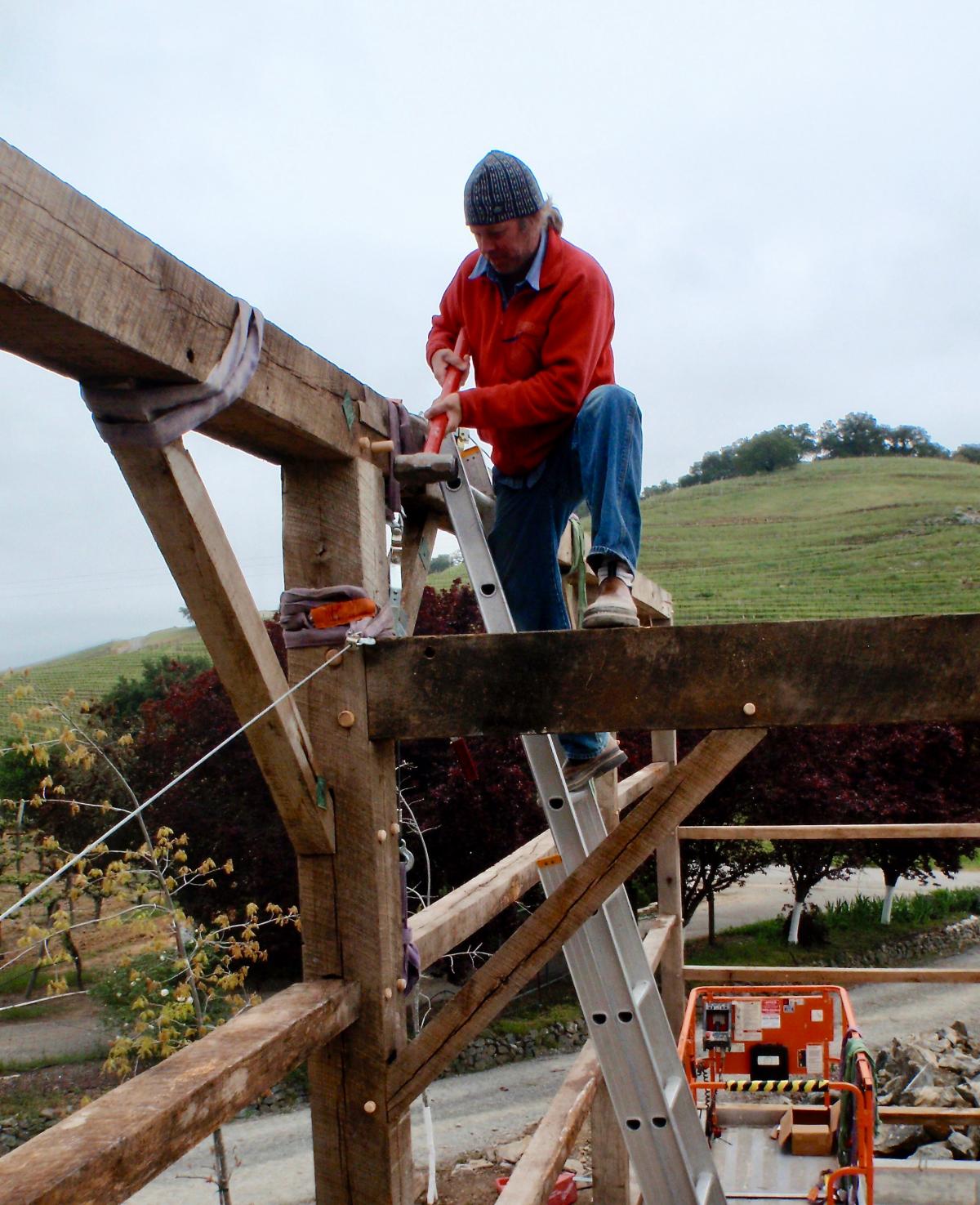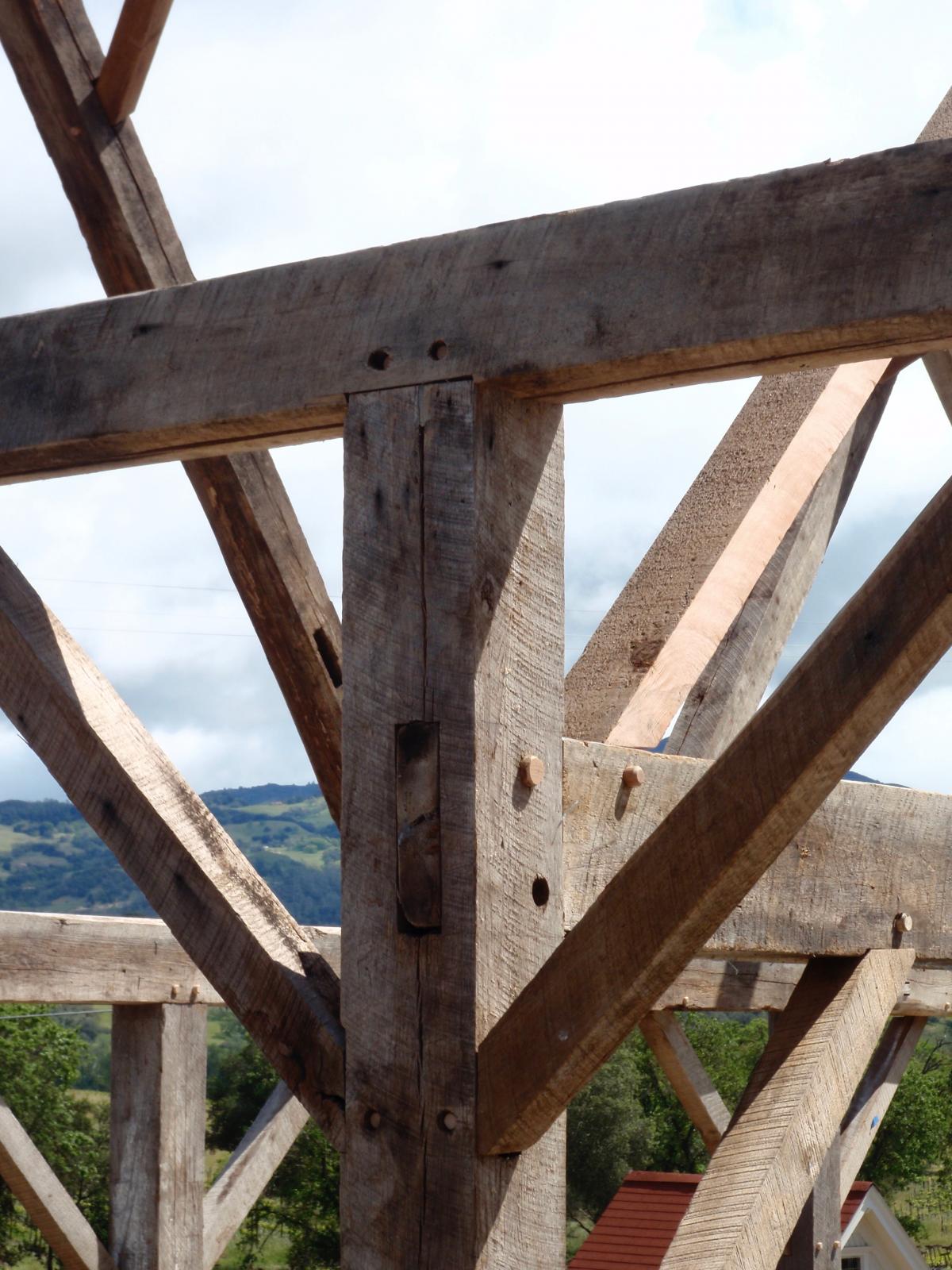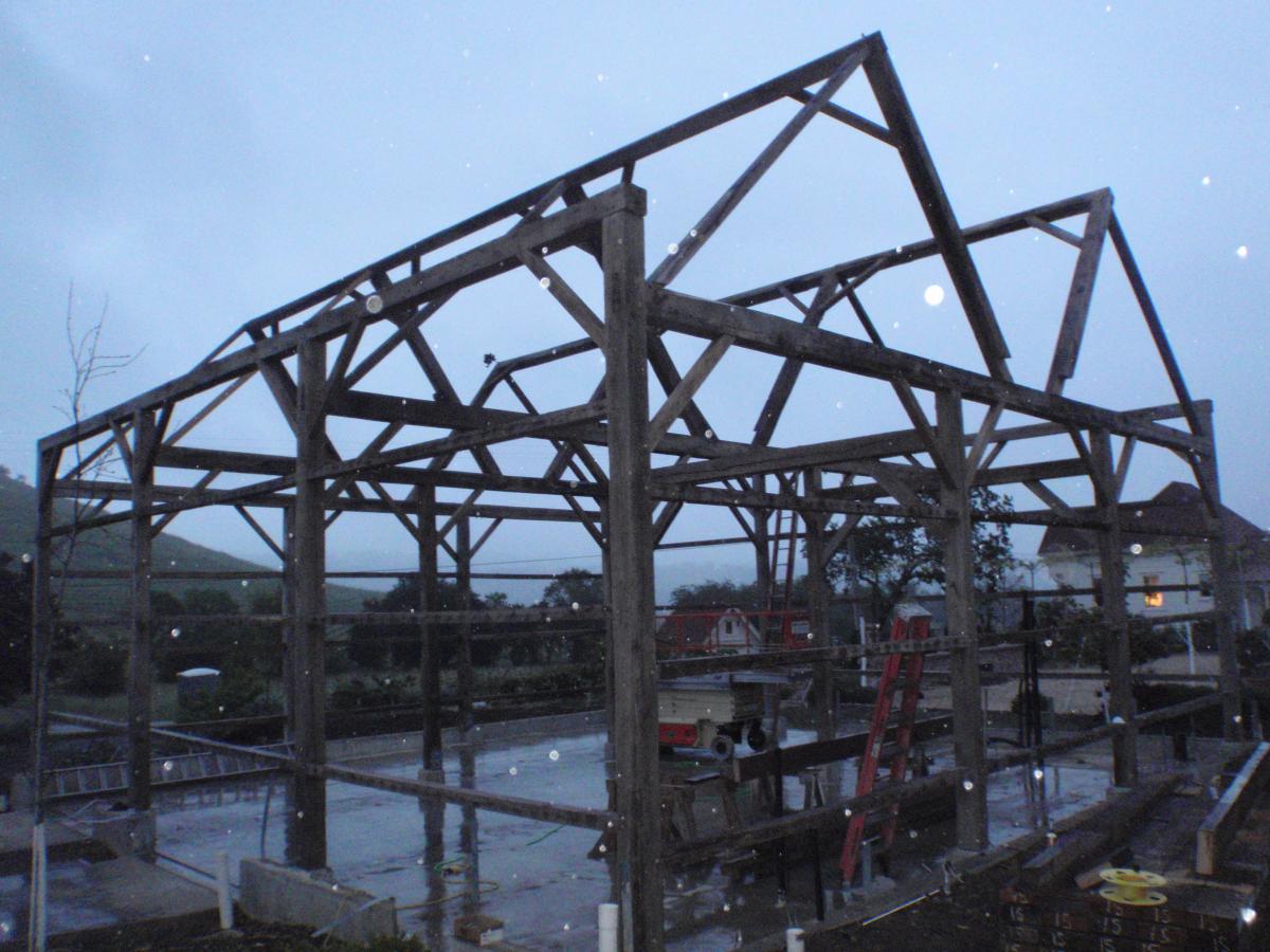 This frame was salvaged from Iowa, dismantled by the Amish and shipped to us in Oregon. We completely restored the frame, repaired all joints, modified the frame with recycled timbers, adding new beams, creating new bays, door openings and window openings. It became the "grape crushing station" at a private winery in Sonoma, California.