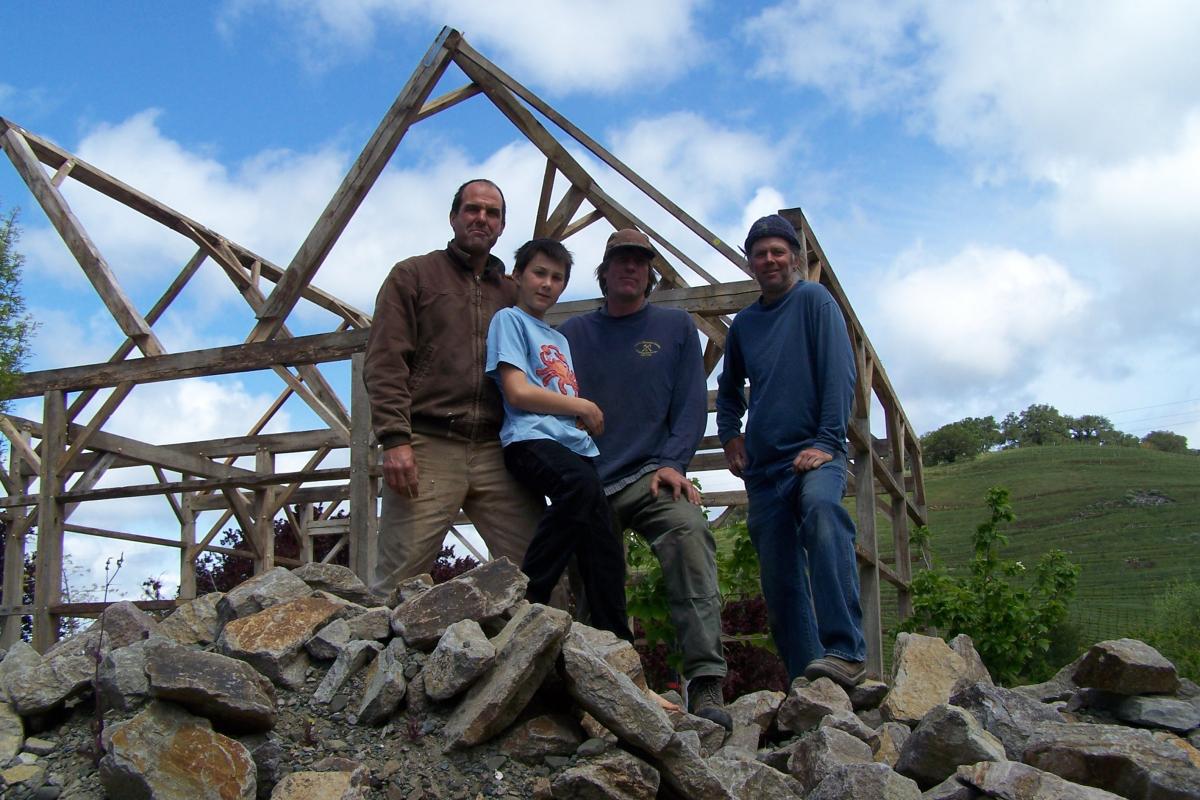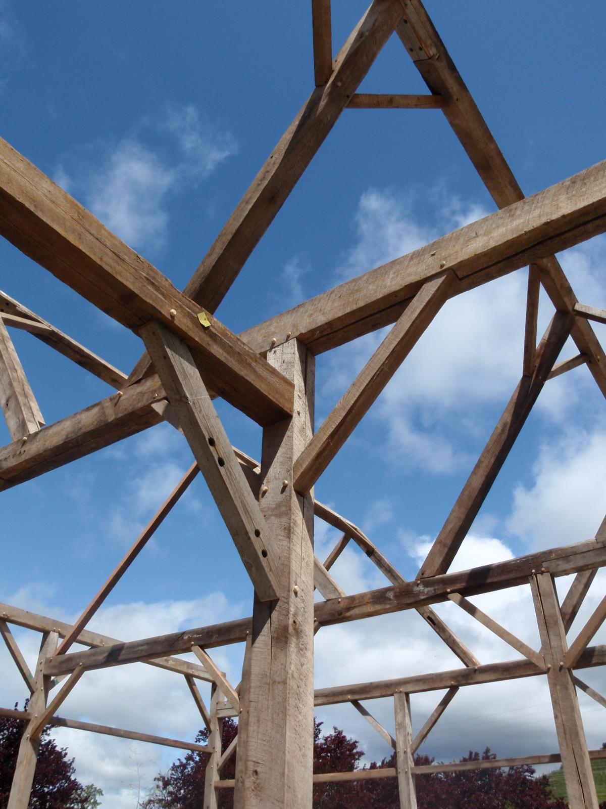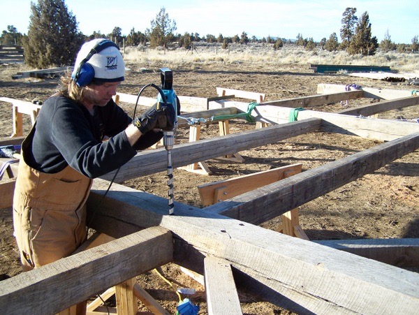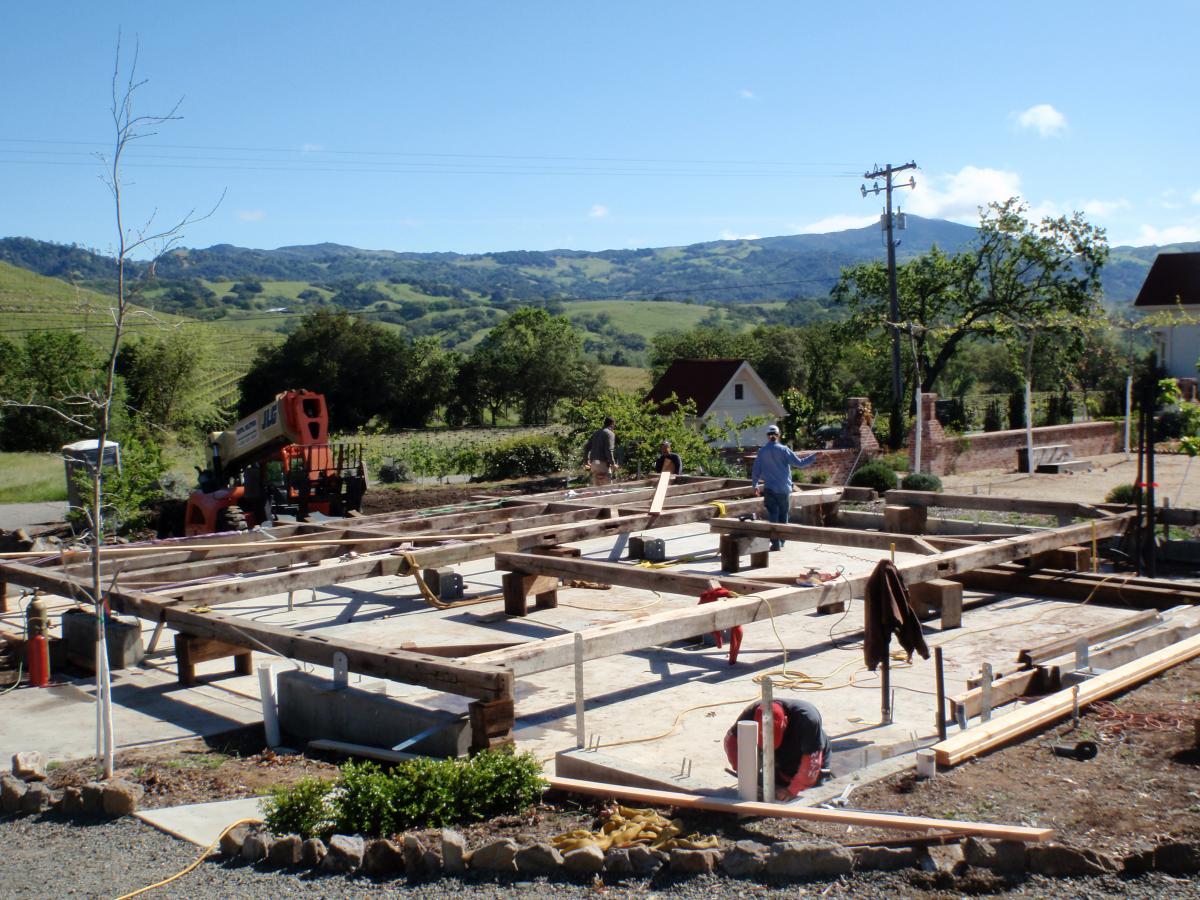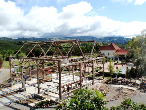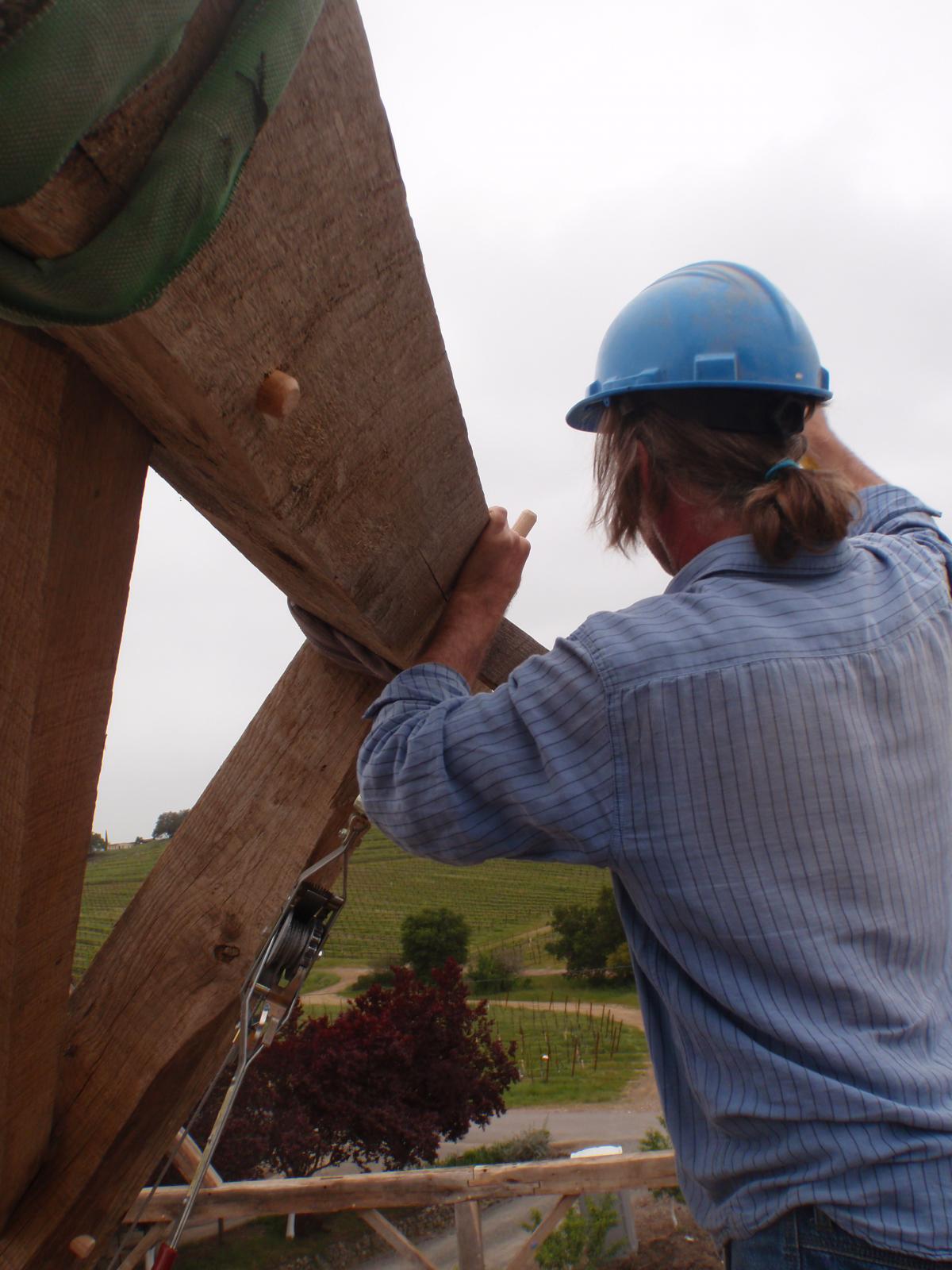 This frame was salvaged from Iowa, dismantled by the Amish and shipped to us in Oregon. We completely restored the frame, repaired all joints, modified the frame with recycled timbers, adding new beams, creating new bays, door openings and window openings. It became the "grape crushing station" at a private winery in Sonoma, California.