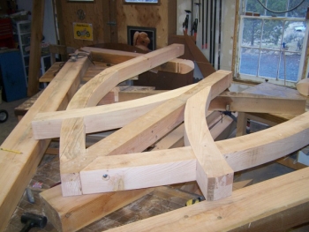 These were some trusses I designed for a community called "The Shire". It had alot of whimsical features and I got to do alot of very fun work for them. We wanted to have a gothic look in these trusses. Here is one being fit up in the shop.