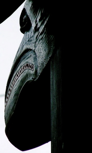 Interior view of Northwest style/gargoyle ravens head of motorcycle hut.