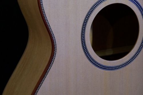 This is a work in progress. I've made the top from Port Orford Cedar which came from an estimated 800 year old tree, harvested from a local fire in Oregon. Honduran Mahogany sides and back, Bloodwood binding and herringbone trim and centerhole. Plan is to stain back and sides ebony, keeping very light top, with the red bloodwood. Again, going for a Northwest theme of sorts. Working on Mahogany neck currently.