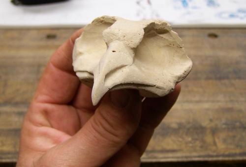I found the skull of a hawk in a tree branch sometime ago. I wanted to mount it on a sculpture I was doing and learned you are not allowed to own such a thing, and that the work could be easily confiscated and I could be fined. I got some pumice stone near where I found the skull and used the head as a model, and carved this head from the stone. A very easy stone to carve, using woodworking tools. I have since returned the skull to the tree and can still visit it when I please.