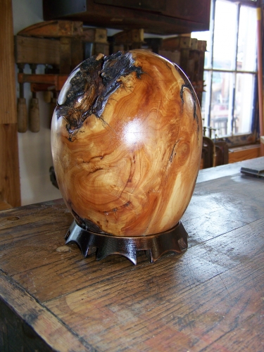 I used a burl I've been harboring for years to create this Urn. My lathe at the time was too small for the burl, and I'd promised to make this in just 3 days. I ended up mounting it on my drillpress with a big lag as my bit. I used a chainsaw blade on a grinder to roughly shape then rough sanding belts to fine tune. The base is removable and urn is hollowed out from the bottom to store the ashes.