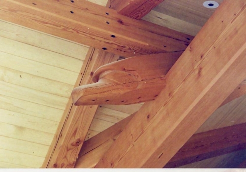 Finished carving from ground view. Reclaimed Doug Fir, hence all the black bolt holes in timber.