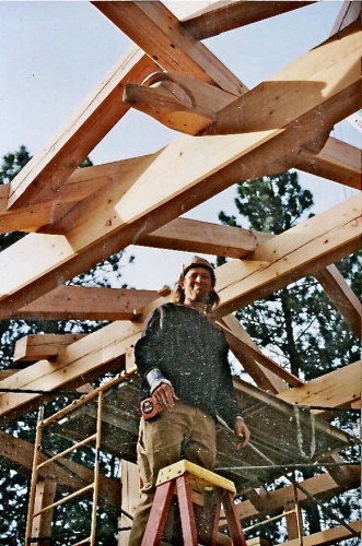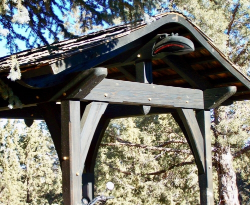 I designed and built this to park my motorcycles under. I went for a Northwest style/Gargoyle ridge beam carving to fend off evil doers and protect my bikes. I stained the structure ebony, keeping with a gothic theme.